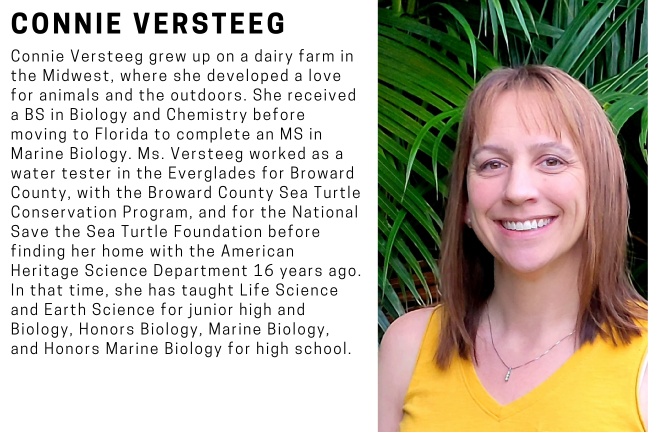 Connie Versteeg grew up on a dairy farm in the Midwest, where she developed a love for animals and the outdoors. She received a BS in Biology and Chemistry before moving to Florida to complete an MS in Marine Biology. Ms. Versteeg worked as a water tester in the Everglades for Broward County, with the Broward County Sea Turtle Conservation Program, and for the National Save the Sea Turtle Foundation before finding her home with the American Heritage Science Department 16 years ago. In that time, she has taught Life Science and Earth Science for junior high and Biology, Honors Biology, Marine Biology, and Honors Marine Biology for high school.